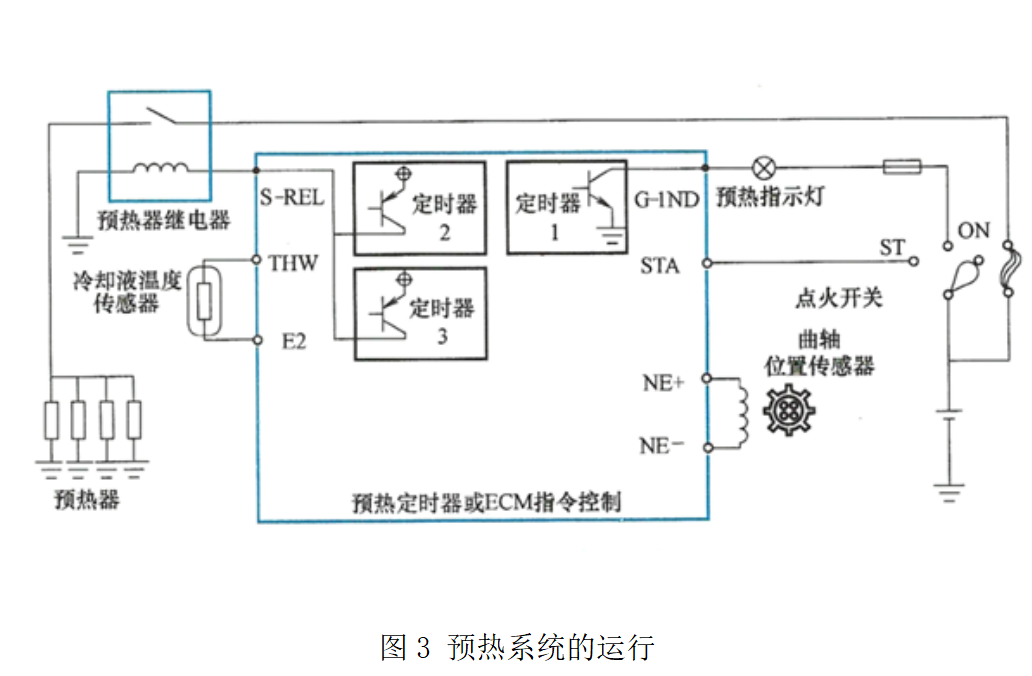 ② 當(dāng)起動(dòng)開關(guān)旋至ST時(shí),預(yù)熱定時(shí)器或ECU指令控制將預(yù)熱器接通,防止預(yù)熱器溫度在起動(dòng)時(shí)下降和改善起動(dòng)性能。