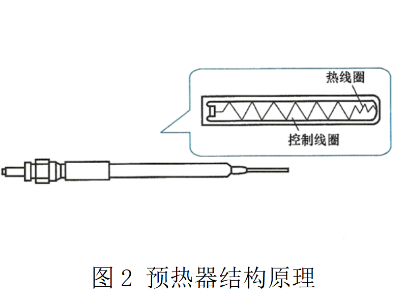 用于加熱燃燒室的空氣,如圖1所示;預(yù)熱器又稱為預(yù)熱塞,其結(jié)構(gòu)原理如圖2所示。預(yù)熱器內(nèi)裝有控制線圈,當(dāng)其電阻隨著溫度的升高而增加時(shí),可以減少流往與控制線圈串聯(lián)的熱線圈的電流量,使預(yù)熱器的溫度不會(huì)上升過高。預(yù)熱器的溫度可升至約900℃。
